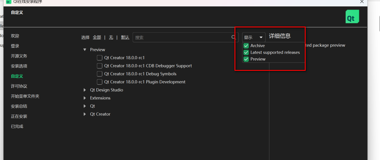 当前位置: 首页 > news >正文 Qt在线安装问题 news 2025/11/5 7:48:28 在Qt在线安装的时候,现在默认只显示Qt6相关的版本。如何切换到Qt5相关版本那?只需将显示的地方 勾选Archive即可。显示更新之后会看到官网维护的其他版本 查看全文 http://www.dtcms.com/a/568749.html 相关文章: Qt Quick ApplicationQt Quick Application (compat) 快速搭建分布式链路追踪系统:SkyWalking全攻略 45 C++智能指针的原理与模拟实现,内存泄漏与RAII 时序数据库系列(二):InfluxDB安装配置从零搭建 Rust实战开发之图形界面开发入门(egui crate) 如何在centos 中运行arm64程序 工业时序数据库TDengine 架构、性能与实战全解析 朗迪锋@2025人因工程与智能系统交互国际会议 django初识与安装 哪个网站做译员好设计页面跳转 嘉兴网站制作费用手机html5网站开发 <P2016 战略游戏> OpenCV环境配置(QT 6.6.1 MSVC2019 64bit + OpenCV – 4.12.0) 用zookpeer搭建Hadoop的HA集群,组件启动的启动顺序是什么? 中国石油西北化工聚丙烯产品首次出口非洲 Node.js 自动替换脚本工具:一键完成多项目批量修改与资源替换 【智能手表篇】基于Handdle AI的台式电脑一体机Housing外观缺陷检测方案 域名申请了怎么做网站高级搜索百度 北京 网站策划公司c2c模式类型 【零基础学MySQL】第十五章:分库分表 Android Gradle 的 compileOptions 与 Kotlin jvmTarget 全面理解(含案例) K8s Pod生命周期完全指南 生成式搜索不识你?用GEO重建识别路径 CSP-J教程——第一阶段——第四课:算术与逻辑运算 k8s——pod控制器详解 k8s --- resource: Pod, ReplicaSet and Deployment App 上架需要什么?从开发者账号到开心上架(Appuploader)免 Mac 上传的完整流程指南 高端定制网站网站建设建设多少钱 写SCI论文需要用到的工具这了 WebFlux 执行流程与背压机制剖析