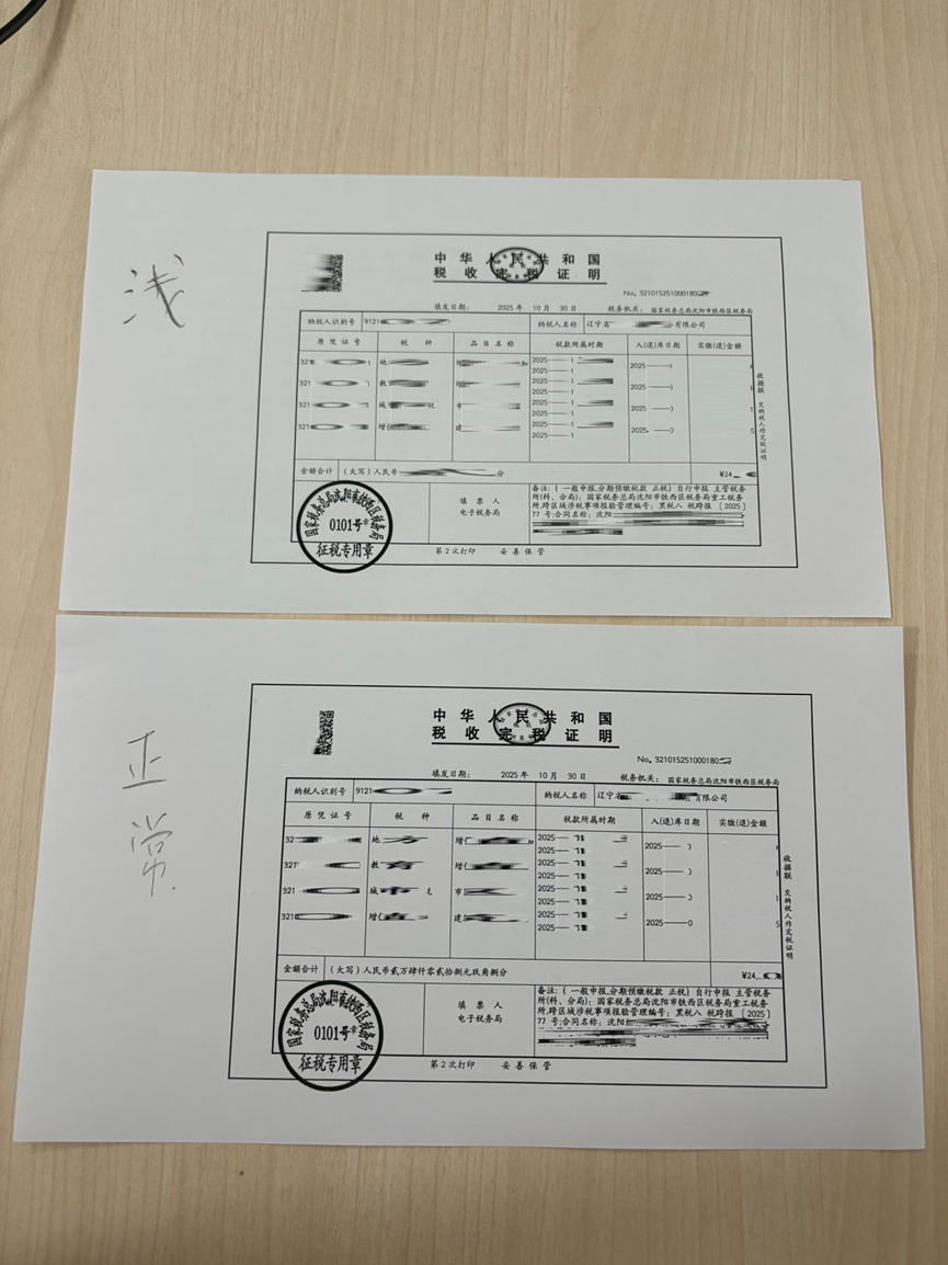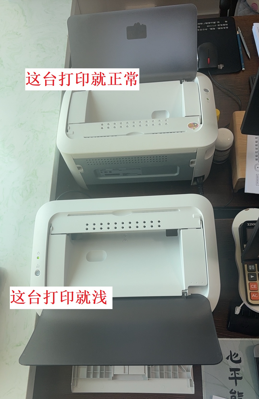 一台佳能LBP6018L黑白激光打印机,新机器,刚拆箱,用户使用才几天,用户在使用过程中发现这台LBP6018L黑白激光打印机打印出来的文档有点浅,怎么发现的呢?用户是财会公司人员,同办公区的同时用的都是佳能的这款LBP6018L黑白激光打印机,对桌同事的那台佳能LBP6018L黑白打印机打印出来的文档字体的颜色粗细就很重,用户经常打印的一般就是A4文件各种资产负债表了,A5纸打印各种发票、票据类的;尤其是A5打印的发票类文件,相同的两台机器对比下来就很明显这台新机器就浅淡很多,而且文字笔画细;具体样式如下图: