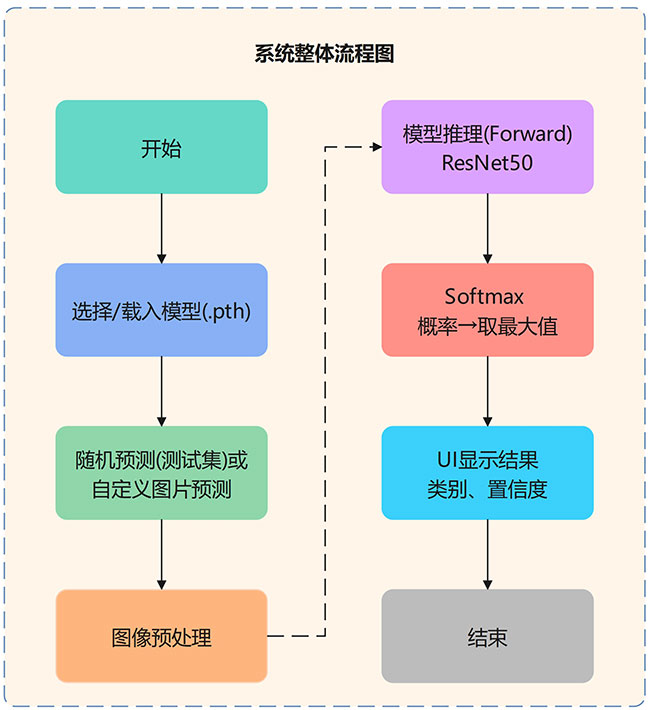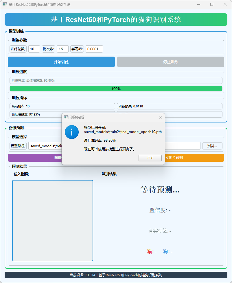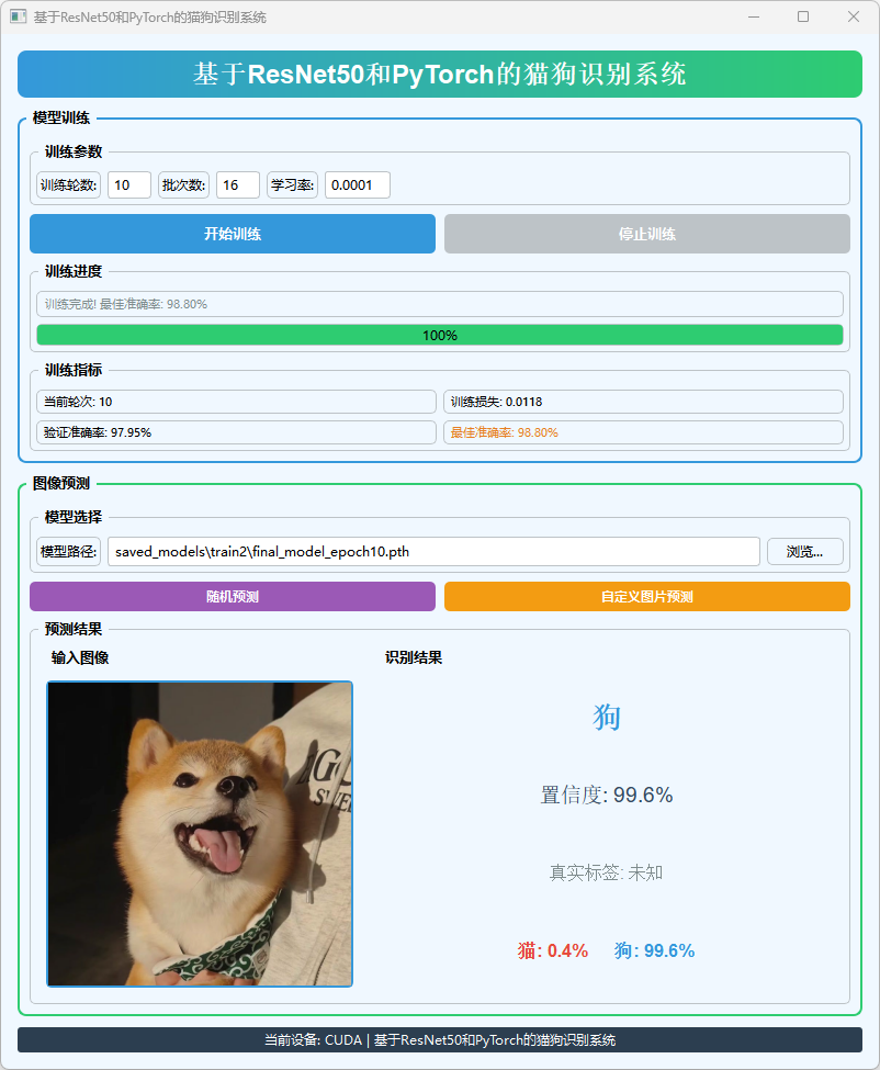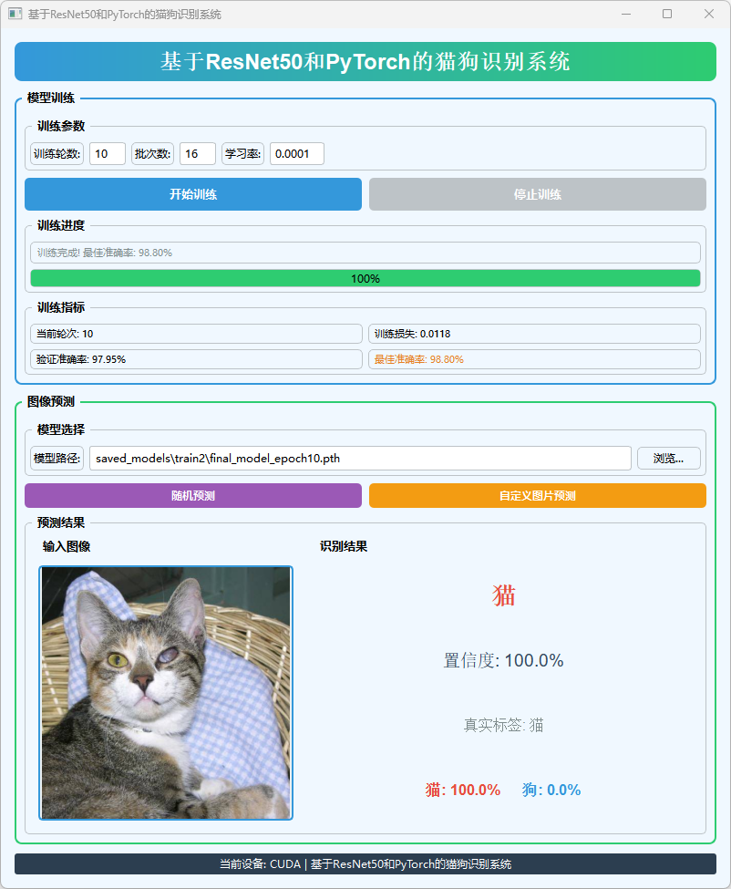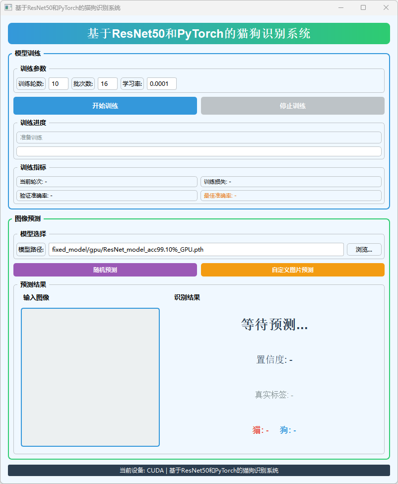 本系统基于ResNet50和PyTorch框架设计,集成了数据预处理、模型训练、图像预测与可视化界面,实现了猫狗图像的高效分类与交互式展示。
