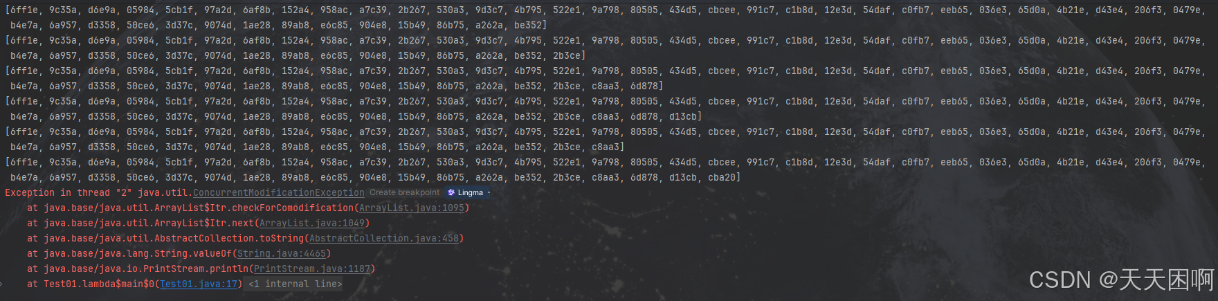 public class Test01 {public static void main(String[] args) {List<String> list = new ArrayList<>();for (int i = 1; i <= 50; i++) {new Thread(()->{list.add(UUID.randomUUID().toString().substring(0,5));System.out.println(list);},String.valueOf(i)).start();}}