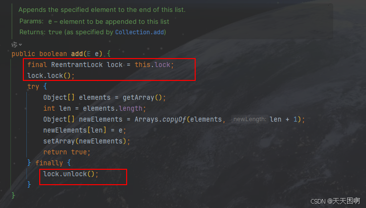 源码中我们可以看到写的操作他加了锁,我们看到他将老数组拷贝了一份然后长度+1得到新数组newElements,然后他把新加入的元素都放到了新数组的最后一位,在把新数组的地址值替换掉老数组的就可以得到了最新的数据