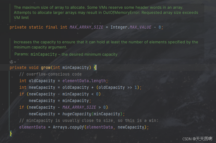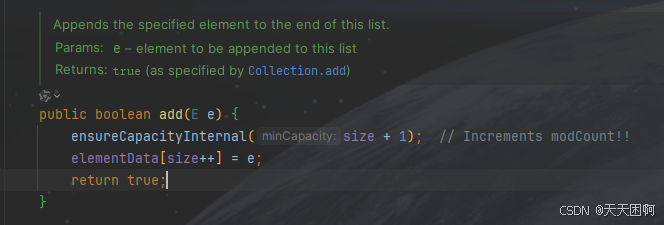 ensureCapacityInternal这个代码的具体实现我们可以先忽略不计,我们先看后边的。它主要作用是判断将新元素添加到列表后,然后看列表的数组大小是否满足的,满足就进行size+1操作,我们都知道ArrayList有扩容机制,如果size+1的之后的长度大于了这个数组的长度,我们就要进行扩容操作