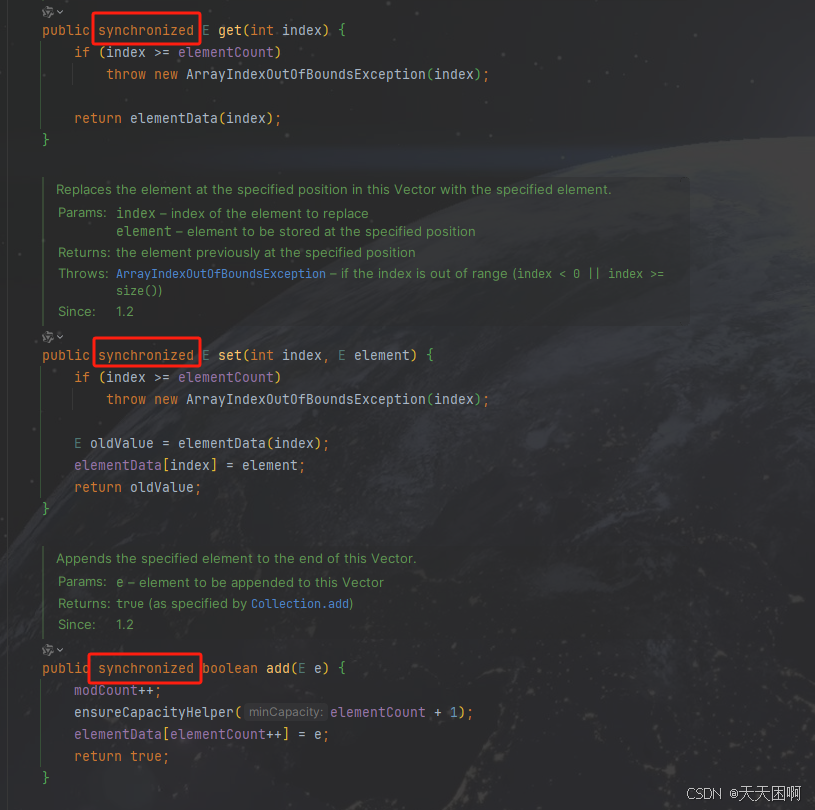 上图是Vector中一些操作的源码,我们可以从源码就看到这些操作他都使用了synchronized,这些操作就证明了是线程安全的