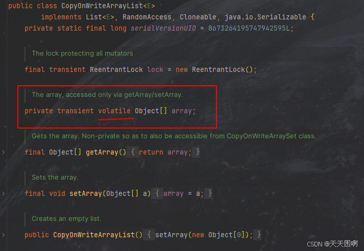 从源码中我们可以看到他底层其实也是一个数组,使用了volatile关键字修饰,保证了不同线程对这个数组操作时的可见性