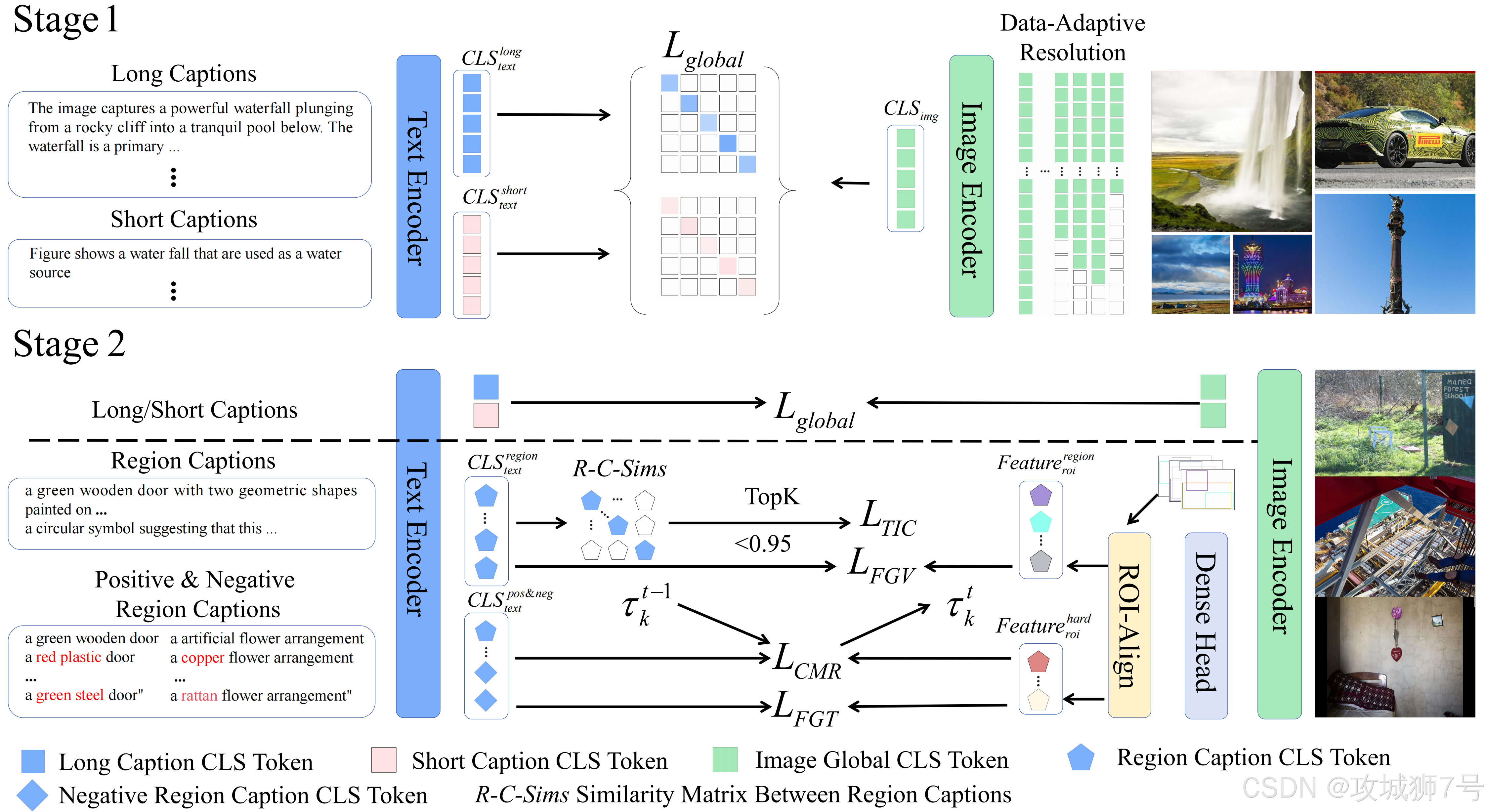 (1)第一阶段:构建坚实的语义基座。在这个阶段,模型的目标是建立广泛的图文联系。它不再只学习图片的简短标题,而是同时学习一个由大模型生成的、内容详尽的长描述。短文本提供了核心标签,长描述则注入了丰富的上下文、物体属性和结构化知识。通过同时消化这两种文本,模型在初期就构建了远比过去深厚的语义基础。