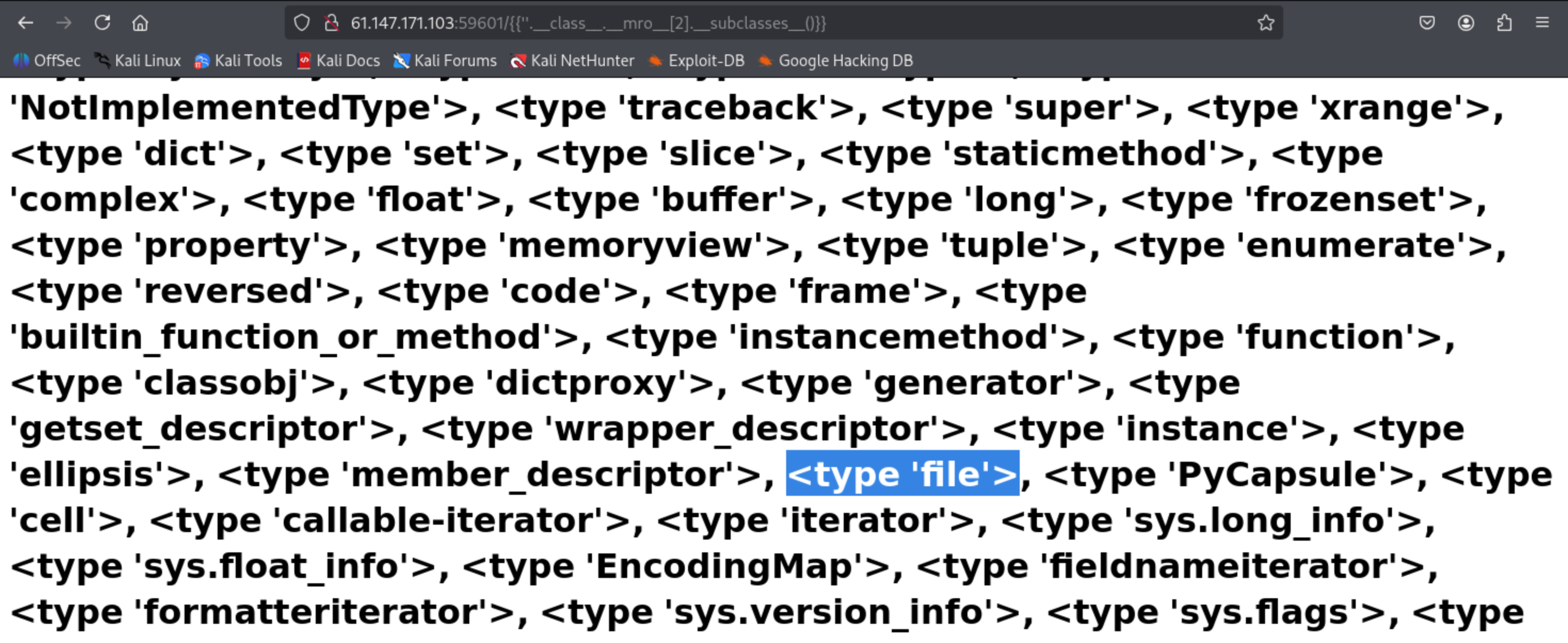 使用payload获取object类所有的子类([2]表示返回元组的第三个元素,<type 'object'>)。可以看到有一个type file类型(可以进行文件读取)。