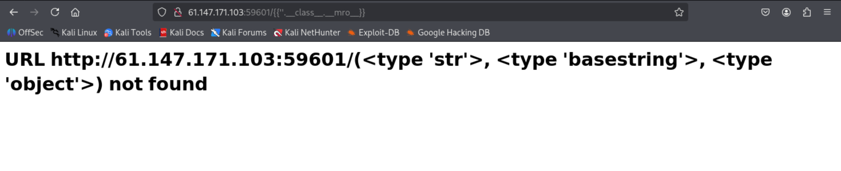 "{{ ''.__class__.__mro__ }}" # → (<class 'str'>, <class 'object'>)