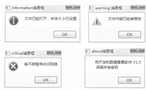 对于warning()、information()、critical()和 about()这几种对话框,它们一般只有一个OK按钮,且无须关心对话框的返回值。所以,使用缺省的按钮设置即可。下面是程序中点击按钮弹出的对话框。