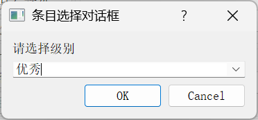 { //条目选择输入QStringList items; //ComboBox 列表的内容items <<"优秀"<<"良好"<<"合格"<<"不合格";QString dlgTitle="条目选择对话框";QString txtLabel="请选择级别";int curIndex=0; //初始选择项bool editable=true; //ComboBox是否可编辑bool ok=false;QString text = QInputDialog::getItem(this, dlgTitle,txtLabel,items,curIndex,editable,&ok);if (ok && !text.isEmpty())ui->plainTextEdit->appendPlainText(text);