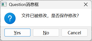 {QString dlgTitle="Question消息框";QString strInfo="文件已被修改,是否保存修改?";QMessageBox::StandardButton defaultBtn=QMessageBox::NoButton; //缺省按钮QMessageBox::StandardButton result;//返回选择的按钮result=QMessageBox::question(this, dlgTitle, strInfo,QMessageBox::Yes|QMessageBox::No |QMessageBox::Cancel,defaultBtn);if (result==QMessageBox::Yes)ui->plainTextEdit->appendPlainText("Question消息框: Yes 被选择");else if(result==QMessageBox::No)ui->plainTextEdit->appendPlainText("Question消息框: No 被选择");else if(result==QMessageBox::Cancel)ui->plainTextEdit->appendPlainText("Question消息框: Cancel 被选择");elseui->plainTextEdit->appendPlainText("Question消息框: 无选择");