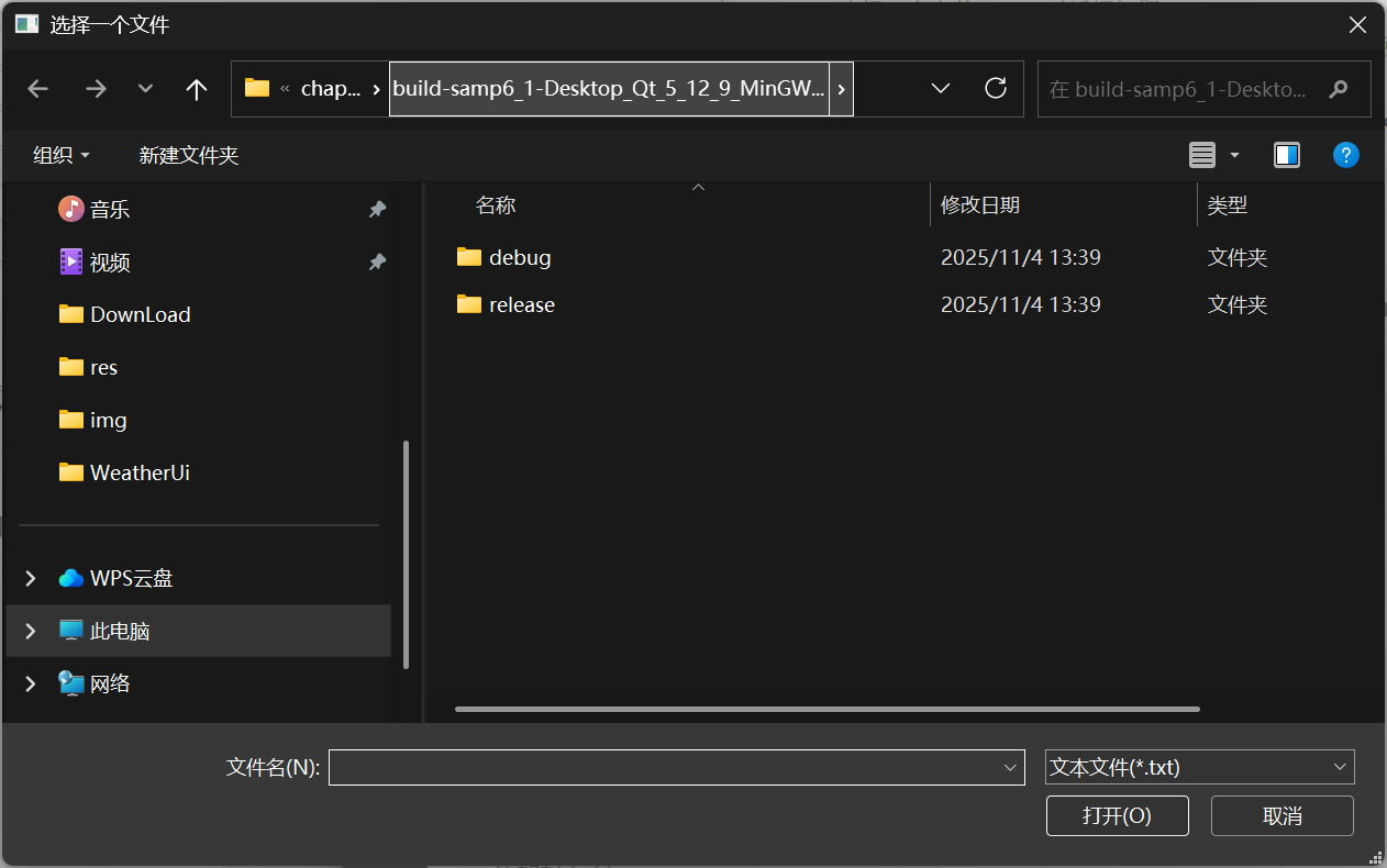 // QString curPath=QCoreApplication::applicationDirPath(); //获取应用程序的路径QString dlgTitle="选择一个文件"; //对话框标题QString filter="文本文件(*.txt);;图片文件(*.jpg *.gif *.png);;所有文件(*.*)"; //文件过滤器QString aFileName=QFileDialog::getOpenFileName(this,dlgTitle,curPath,filter);if (!aFileName.isEmpty())ui->plainTextEdit->appendPlainText(aFileName);