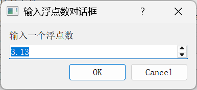 { //输入浮点数QString dlgTitle="输入浮点数对话框";QString txtLabel="输入一个浮点数";float defaultValue=3.13;float minValue=0, maxValue=10000; //范围int decimals=2;//小数点位数bool ok=false;float inputValue = QInputDialog::getDouble(this, dlgTitle,txtLabel,defaultValue, minValue,maxValue,decimals,&ok);if (ok) //确认选择{QString str=QString::asprintf("输入了一个浮点数:%.2f",inputValue);ui->plainTextEdit->appendPlainText(str);}