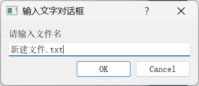 { //输入字符串QString dlgTitle="输入文字对话框";QString txtLabel="请输入文件名";QString defaultInput="新建文件.txt";QLineEdit::EchoMode echoMode=QLineEdit::Normal;//正常文字输入