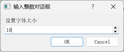 {//输入整数QString dlgTitle="输入整数对话框";QString txtLabel="设置字体大小";int defaultValue=ui->plainTextEdit->font().pointSize(); //现有字体大小int minValue=6, maxValue=50,stepValue=1; //范围,步长bool ok=false;int inputValue = QInputDialog::getInt(this, dlgTitle,txtLabel,defaultValue, minValue,maxValue,stepValue,&ok);if (ok) //是否确认输入{QFont font=ui->plainTextEdit->font();font.setPointSize(inputValue);ui->plainTextEdit->setFont(font);}