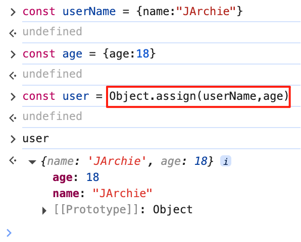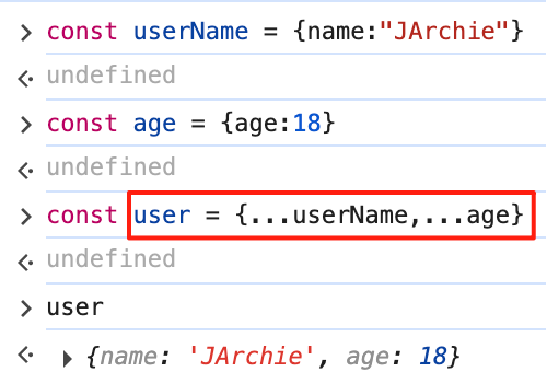 { ...obj }语法可展开对象属性,通过它与解构合并可以实现类似Object.assign的功能,比如:const user = {...userName, ...age},如下图所示: