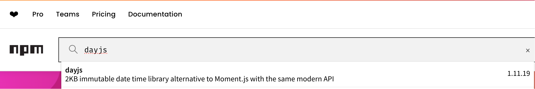 打开https://www.npmjs.com/,在搜索框中输入需要查找的库的名称回车即可查看库的详细信息,比如,可以搜索dayjs,如图所示: