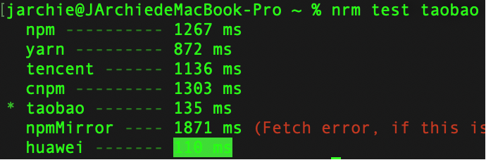 测试命令nrm test taobao会返回连接延迟,例如100毫秒表示连接通畅,此时可安全切换至该源。