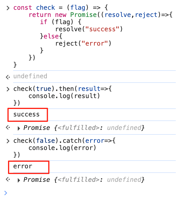 这里咱们还是举个例子吧:定义一个check()函数,当check(true)时触发resolve返回"success",当check(false)时触发reject返回"error",如下图所示: