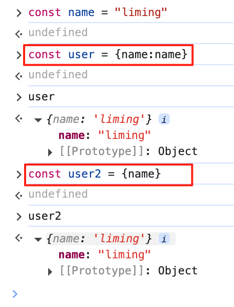 ES6对象属性简写规则:当属性名与变量名相同时,可省略冒号及值(如const user = {name}等价于{name: name},如下图所示: