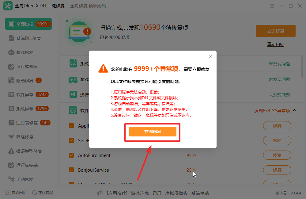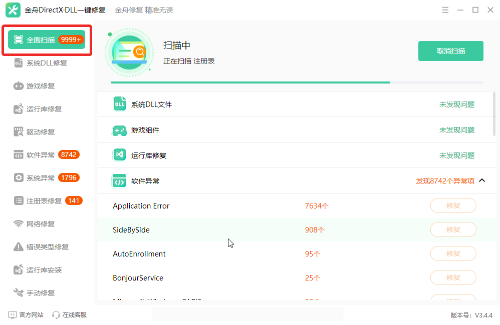 金舟DirectX·DLL一键修复工具凭借“智能全面扫描检测+手动修复”特性,成为解决游戏运行库问题的热门选择。