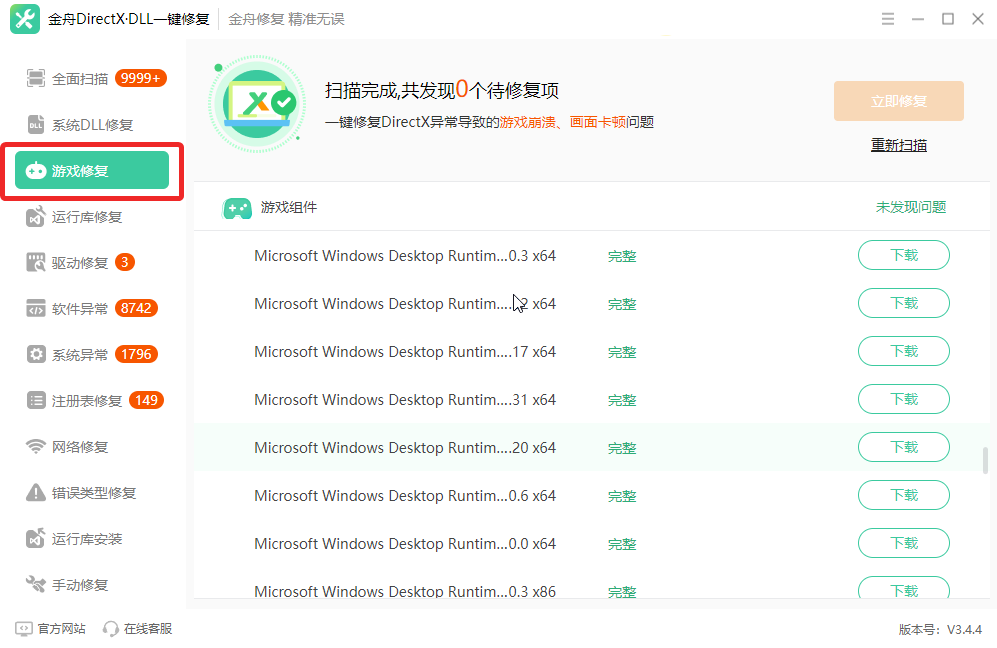 核心优势:软件针对游戏相关问题建立有【游戏修复】功能板块,支持修复DirectX异常导致的游戏崩溃、画面卡顿问题,非常方便。并且提供全面的游戏运行库安装包下载,无需繁琐操作,一键即可实现下载安装。