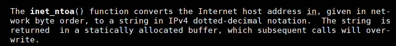 man手册上说,inet_ntoa函数,是把这个返回结果放到了静态缓冲区(也就是使用了static),这个时候不需要我们手动进行释放。如果我们调用多次这个函数,会导致覆写。