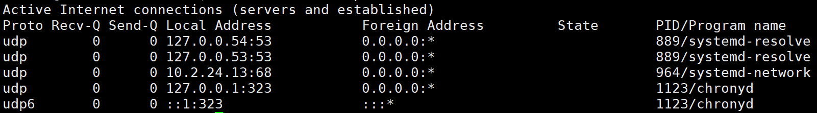 其中,proto表示用的协议;Recv-Q和Send-Q分别表示收和发报文的个数;Local Address指本地地址,里面是IP地址+端口号;Foreign Address是指远端,里面为0.0.0.0:*表示能收到来自任何远端发送的消息;State指状态;PID/Program name指进程pid和名字。