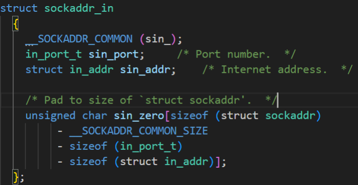 其中sin_family应该为AF_INET,sin_port是指端口号(网络字节序),sin_addr中的s_addr是指IP地址(网络字节序),sin_zero为填充字段,不需要管。
