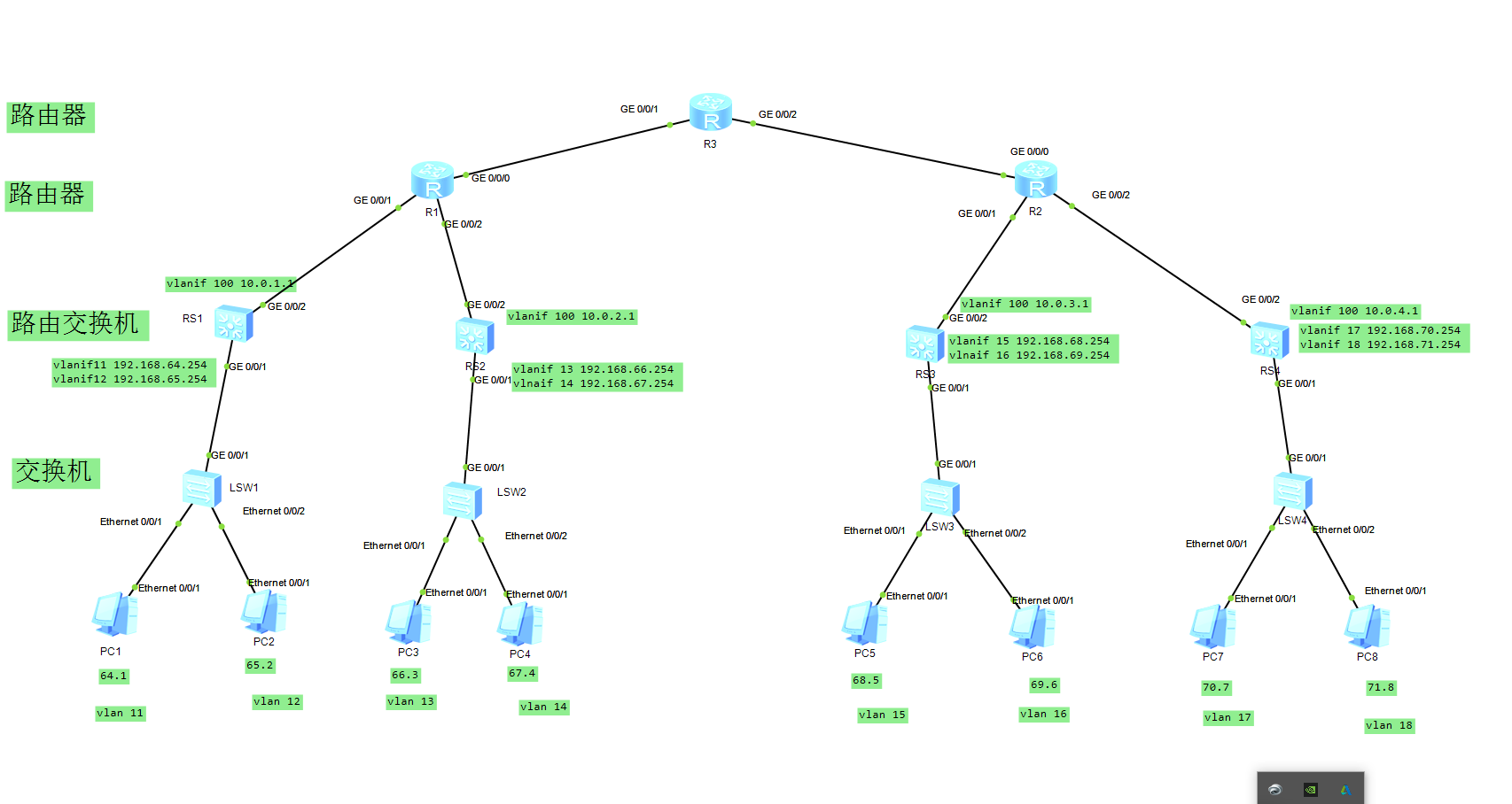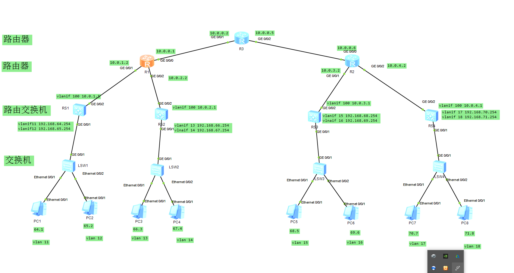[Huawei-Vlanif100]quit4)同时物理上需要将RS1向上与路由器R1连接的接口连接方式进行修改,也就是将RS1下面的所有设备当成一个主机,向上时统一出口是10.0.1.1(虚拟成一台主机)