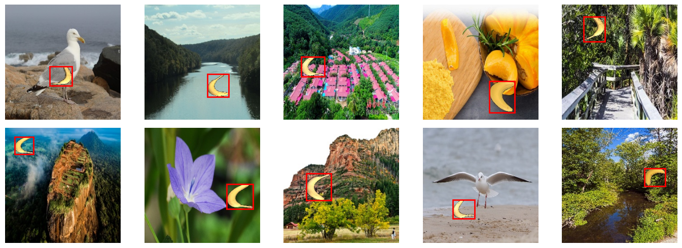 for i, ax in enumerate(axes.flatten()):ax.imshow(imgs[i]) ax.axis('off')bbox = batch[1][i][0][1:5] * 256 rect = patches.Rectangle((bbox[0], bbox[1]), bbox[2] - bbox[0], bbox[3] - bbox[1], linewidth=2,edgecolor='r',facecolor='none')ax.add_patch(rect)