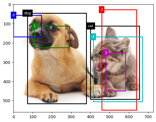 def show_bboxes(axes, bboxes, labels=None, colors=None):"""显示所有边界框"""def _make_list(obj, default_values=None):if obj is None:obj = default_valueselif not isinstance(obj, (list, tuple)):obj = [obj]return objlabels = _make_list(labels)colors = _make_list(colors, ['b', 'g', 'r', 'm', 'c'])for i, bbox in enumerate(bboxes):color = colors[i % len(colors)]x_min, y_min, x_max, y_max = bbox.detach().numpy()rect = patches.Rectangle((x_min, y_min), x_max - x_min, y_max - y_min, linewidth=2,edgecolor=color,facecolor='none')axes.add_patch(rect)if labels and len(labels) > i:text_color = 'k' if color == 'w' else 'w'axes.text(rect.xy[0], rect.xy[1], labels[i],va='center', ha='center', fontsize=9, color=text_color,bbox=dict(facecolor=color, lw=0))