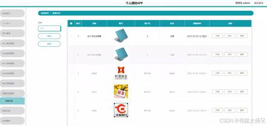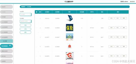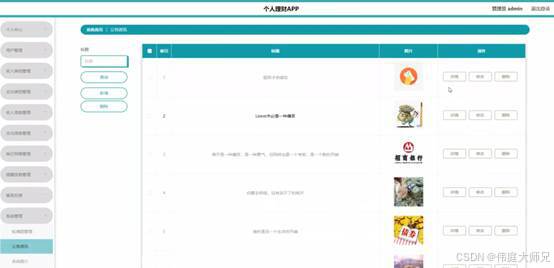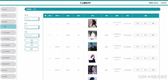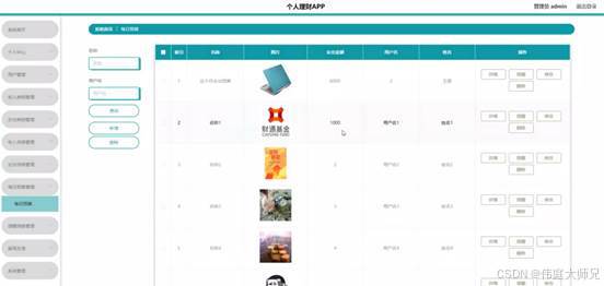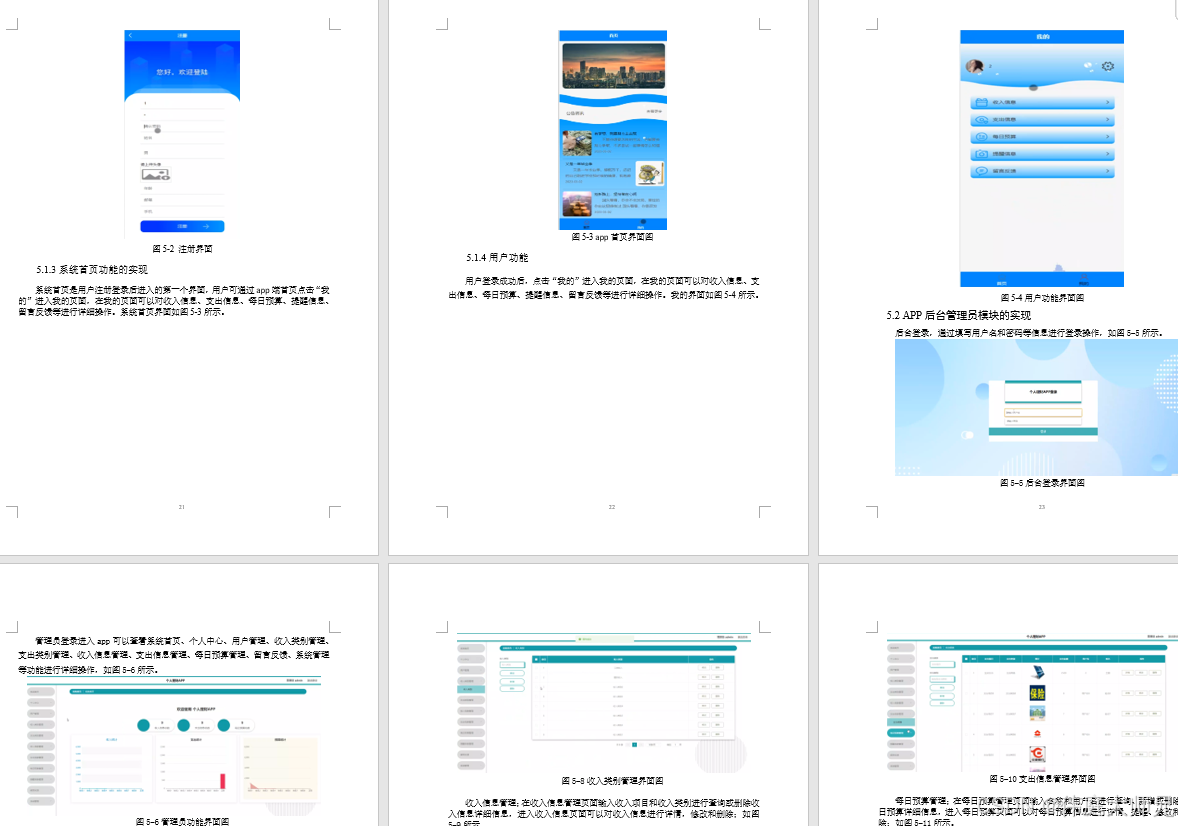 管理员登录进入app可以查看系统首页、个人中心、用户管理、收入类别管理、支出类别管理、收入信息管理、支出信息管理、每日预算管理、留言反馈、系统管理等功能进行详细操作,如图5-6所示。