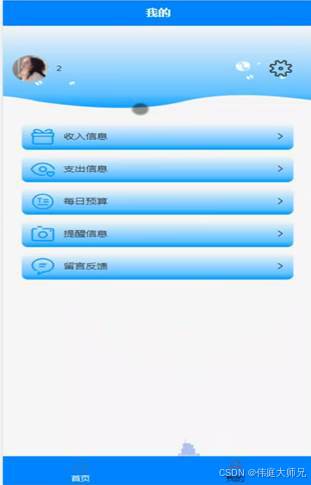 系统首页是用户注册登录后进入的第一个界面,用户可通过app端首页点击“我的”进入我的页面,在我的页面可以对收入信息、支出信息、每日预算、提醒信息、留言反馈等进行详细操作。系统首页界面如图5-3所示。
