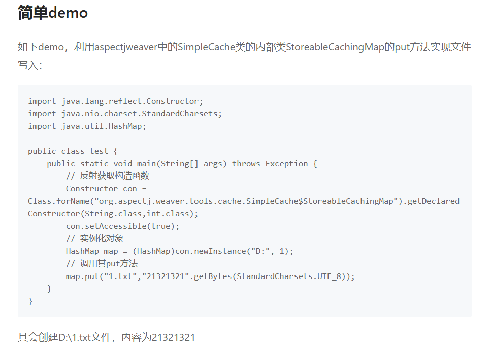 aspectjweaver中有一个SimpleCache类,SimpleCache类中的内部类StoreableCachingMap是一个继承HashMap的类,其重写了HashMap的put方法,put方法中的writeToPath方法执行了写入文件的操作