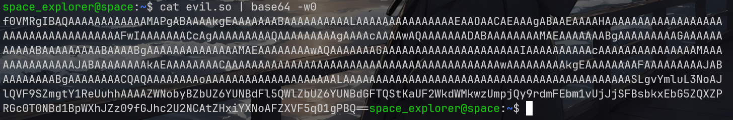 接着执行cat evil.so | base64 -w0获取so文件编码后的内容,base64 -w0表示不换行