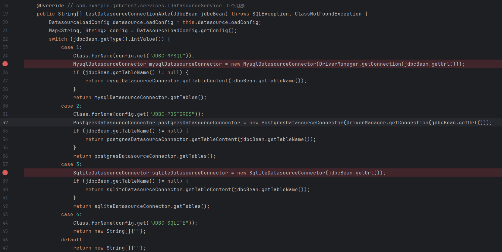 关注services/DatasourceServiceImpl.java,发现其定义了数据库连接的类型,其中url可控且存在利用点,类型1对应Mysql,类型3对应Sqlite