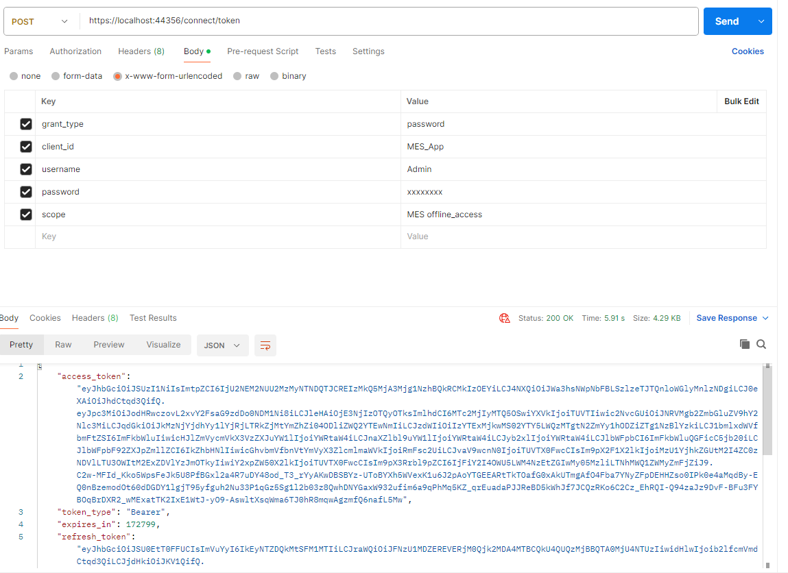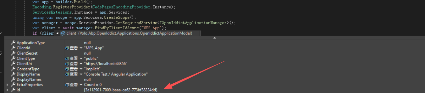 using var scope = app.Services.CreateScope();var manager = scope.ServiceProvider.GetRequiredService<IOpenIddictApplicationManager>();var client = await manager.FindByClientIdAsync("MES_App");if (client == null){Console.WriteLine("not MES_App");}else{Console.WriteLine("MES_App");}发现获取的OpenIddictApplications表里的id与报错id不一致