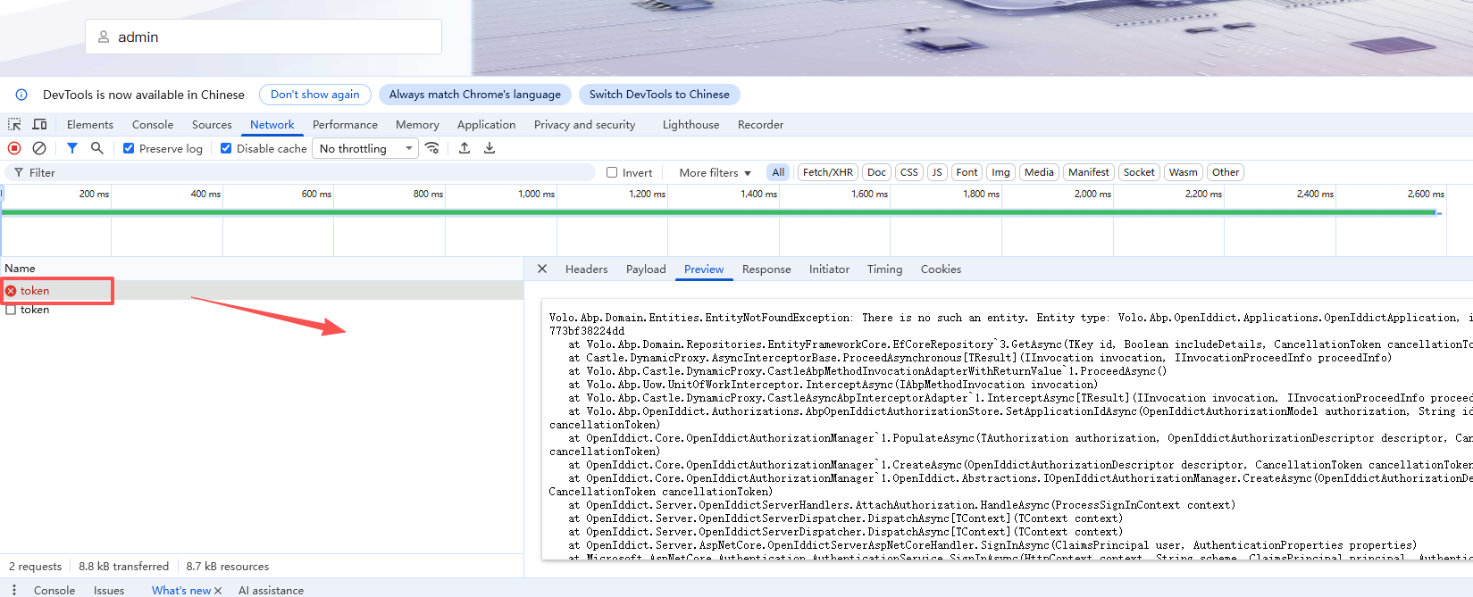 报错内容如下: Volo.Abp.Domain.Entities.EntityNotFoundException: There is no such an entity. Entity type: Volo.Abp.OpenIddict.Applications.OpenIddictApplication, id: 0129113a-0970-aaba-ca62-773bf38224ddat Volo.Abp.Domain.Repositories.EntityFrameworkCore.EfCoreRepository`3.GetAsync(TKey id, Boolean includeDetails, CancellationToken cancellationToken)at Castle.DynamicProxy.AsyncInterceptorBase.ProceedAsynchronous[TResult](IInvocation invocation, IInvocationProceedInfo proceedInfo)at Volo.Abp.Castle.DynamicProxy.CastleAbpMethodInvocationAdapterWithReturnValue`1.ProceedAsync()at Volo.Abp.Uow.UnitOfWorkInterceptor.InterceptAsync(IAbpMethodInvocation invocation)at Volo.Abp.Castle.DynamicProxy.CastleAsyncAbpInterceptorAdapter`1.InterceptAsync[TResult](IInvocation invocation, IInvocationProceedInfo proceedInfo, Func`3 proceed)at Volo.Abp.OpenIddict.Authorizations.AbpOpenIddictAuthorizationStore.SetApplicationIdAsync(OpenIddictAuthorizationModel authorization, String identifier, CancellationToken cancellationToken)at OpenIddict.Core.OpenIddictAuthorizationManager`1.PopulateAsync(TAuthorization authorization, OpenIddictAuthorizationDescriptor descriptor, CancellationToken cancellationToken)at OpenIddict.Core.OpenIddictAuthorizationManager`1.CreateAsync(OpenIddictAuthorizationDescriptor descriptor, CancellationToken cancellationToken)at OpenIddict.Core.OpenIddictAuthorizationManager`1.OpenIddict.Abstractions.IOpenIddictAuthorizationManager.CreateAsync(OpenIddictAuthorizationDescriptor descriptor, CancellationToken cancellationToken)at OpenIddict.Server.OpenIddictServerHandlers.AttachAuthorization.HandleAsync(ProcessSignInContext context)at OpenIddict.Server.OpenIddictServerDispatcher.DispatchAsync[TContext](TContext context)at OpenIddict.Server.OpenIddictServerDispatcher.DispatchAsync[TContext](TContext context)at OpenIddict.Server.AspNetCore.OpenIddictServerAspNetCoreHandler.SignInAsync(ClaimsPrincipal user, AuthenticationProperties properties)at Microsoft.AspNetCore.Authentication.AuthenticationService.SignInAsync(HttpContext context, String scheme, ClaimsPrincipal principal, AuthenticationProperties properties)at Microsoft.AspNetCore.Mvc.Infrastructure.ResourceInvoker.<InvokeNextResultFilterAsync>g__Awaited|30_0[TFilter,TFilterAsync](ResourceInvoker invoker, Task lastTask, State next, Scope scope, Object state, Boolean isCompleted)at Microsoft.AspNetCore.Mvc.Infrastructure.ResourceInvoker.Rethrow(ResultExecutedContextSealed context)at Microsoft.AspNetCore.Mvc.Infrastructure.ResourceInvoker.ResultNext[TFilter,TFilterAsync](State& next, Scope& scope, Object& state, Boolean& isCompleted)at Microsoft.AspNetCore.Mvc.Infrastructure.ResourceInvoker.<InvokeResultFilters>g__Awaited|28_0(ResourceInvoker invoker, Task lastTask, State next, Scope scope, Object state, Boolean isCompleted)at Microsoft.AspNetCore.Mvc.Infrastructure.ResourceInvoker.<InvokeNextResourceFilter>g__Awaited|25_0(ResourceInvoker invoker, Task lastTask, State next, Scope scope, Object state, Boolean isCompleted)at Microsoft.AspNetCore.Mvc.Infrastructure.ResourceInvoker.Rethrow(ResourceExecutedContextSealed context)at Microsoft.AspNetCore.Mvc.Infrastructure.ResourceInvoker.Next(State& next, Scope& scope, Object& state, Boolean& isCompleted)at Microsoft.AspNetCore.Mvc.Infrastructure.ResourceInvoker.<InvokeFilterPipelineAsync>g__Awaited|20_0(ResourceInvoker invoker, Task lastTask, State next, Scope scope, Object state, Boolean isCompleted)at Microsoft.AspNetCore.Mvc.Infrastructure.ResourceInvoker.<InvokeAsync>g__Awaited|17_0(ResourceInvoker invoker, Task task, IDisposable scope)at Microsoft.AspNetCore.Mvc.Infrastructure.ResourceInvoker.<InvokeAsync>g__Awaited|17_0(ResourceInvoker invoker, Task task, IDisposable scope)at JC.AI.MES.MESHttpApiHostModule.<>c.<<OnApplicationInitialization>b__16_1>d.MoveNext() in E:\abp\JC.AI.MES\aspnet-core\src\JC.AI.MES.HttpApi.Host\MESHttpApiHostModule.cs:line 823 --- End of stack trace from previous location ---at Volo.Abp.AspNetCore.Serilog.AbpSerilogMiddleware.InvokeAsync(HttpContext context, RequestDelegate next)at Microsoft.AspNetCore.Builder.UseMiddlewareExtensions.InterfaceMiddlewareBinder.<>c__DisplayClass2_0.<<CreateMiddleware>b__0>d.MoveNext() --- End of stack trace from previous location ---at Volo.Abp.AspNetCore.Auditing.AbpAuditingMiddleware.InvokeAsync(HttpContext context, RequestDelegate next)at Volo.Abp.AspNetCore.Auditing.AbpAuditingMiddleware.InvokeAsync(HttpContext context, RequestDelegate next)at Microsoft.AspNetCore.Builder.UseMiddlewareExtensions.InterfaceMiddlewareBinder.<>c__DisplayClass2_0.<<CreateMiddleware>b__0>d.MoveNext() --- End of stack trace from previous location ---at Swashbuckle.AspNetCore.SwaggerUI.SwaggerUIMiddleware.Invoke(HttpContext httpContext)at Swashbuckle.AspNetCore.Swagger.SwaggerMiddleware.Invoke(HttpContext httpContext, ISwaggerProvider swaggerProvider)at Microsoft.AspNetCore.Authorization.AuthorizationMiddleware.Invoke(HttpContext context)at Volo.Abp.AspNetCore.Security.Claims.AbpDynamicClaimsMiddleware.InvokeAsync(HttpContext context, RequestDelegate next)at Microsoft.AspNetCore.Builder.UseMiddlewareExtensions.InterfaceMiddlewareBinder.<>c__DisplayClass2_0.<<CreateMiddleware>b__0>d.MoveNext() --- End of stack trace from previous location ---at Volo.Abp.AspNetCore.Uow.AbpUnitOfWorkMiddleware.InvokeAsync(HttpContext context, RequestDelegate next)at Microsoft.AspNetCore.Builder.UseMiddlewareExtensions.InterfaceMiddlewareBinder.<>c__DisplayClass2_0.<<CreateMiddleware>b__0>d.MoveNext() --- End of stack trace from previous location ---at Volo.Abp.AspNetCore.ExceptionHandling.AbpExceptionHandlingMiddleware.InvokeAsync(HttpContext context, RequestDelegate next)at Volo.Abp.AspNetCore.ExceptionHandling.AbpExceptionHandlingMiddleware.InvokeAsync(HttpContext context, RequestDelegate next)at Microsoft.AspNetCore.Builder.UseMiddlewareExtensions.InterfaceMiddlewareBinder.<>c__DisplayClass2_0.<<CreateMiddleware>b__0>d.MoveNext() --- End of stack trace from previous locat