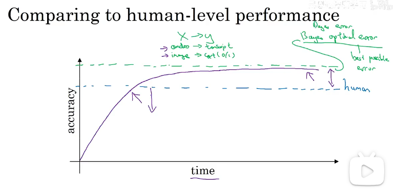 贝叶斯最优误差(最佳可能误差):达到理论最优水平,随时间训练,算法可能更大、更多数据,性能不断接近人类水平,但从不超越理论极限。