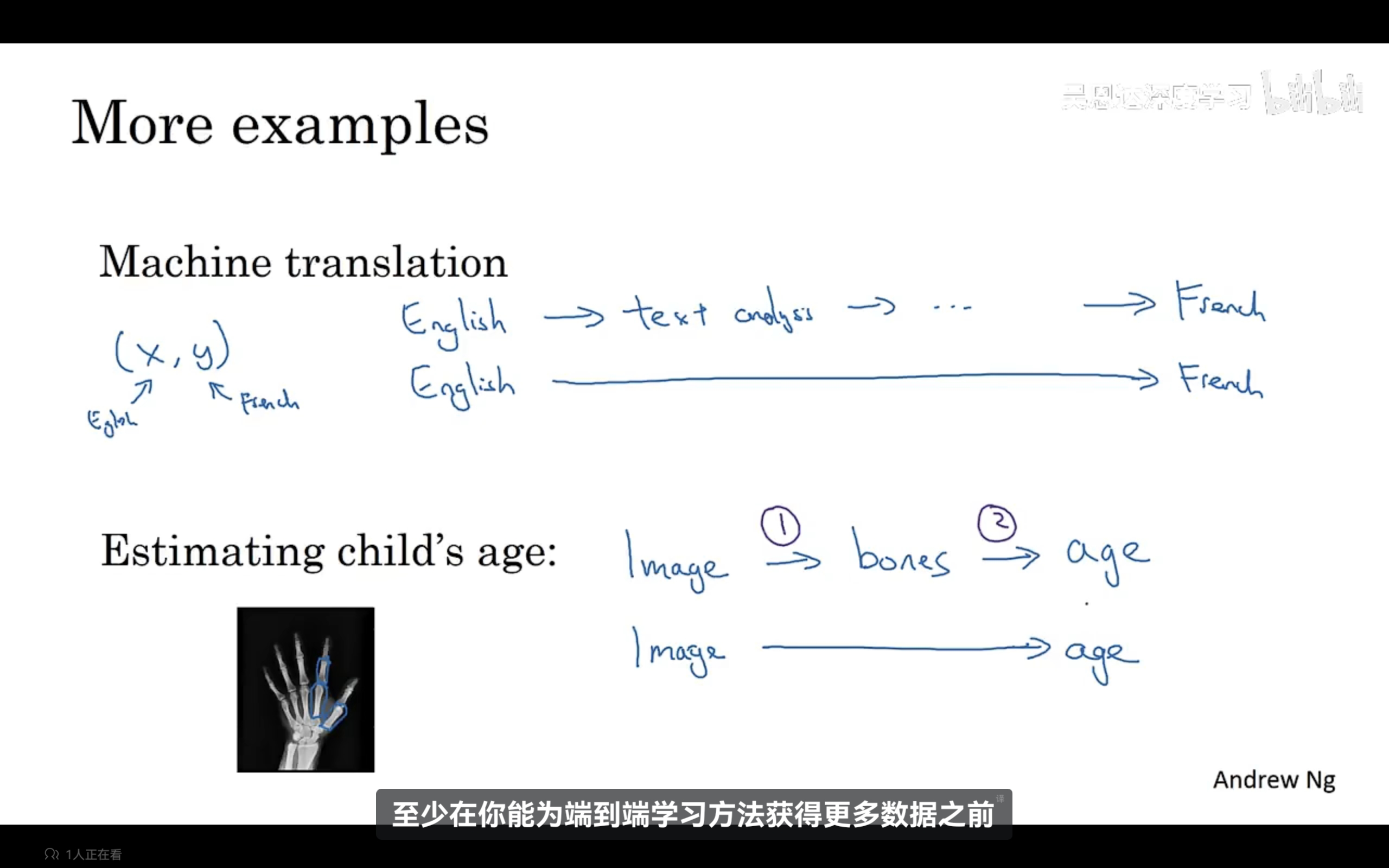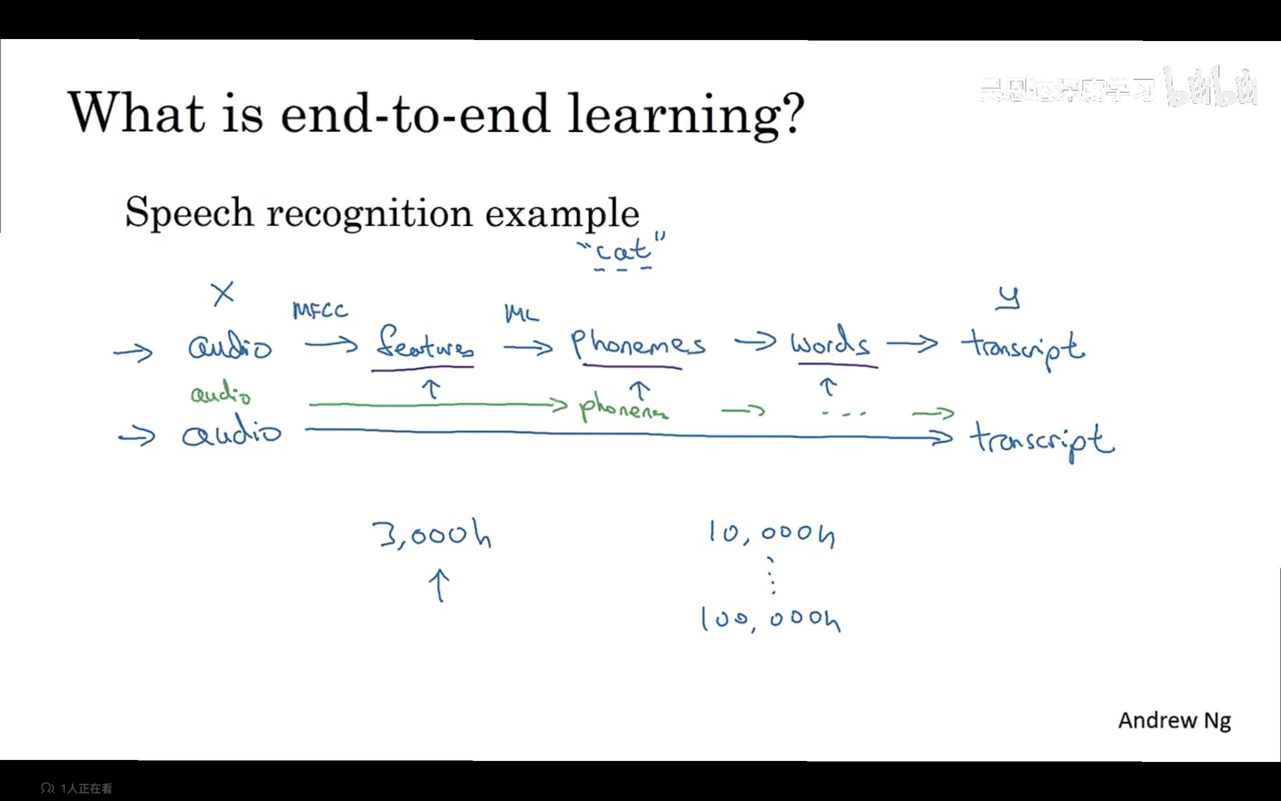 端到端深度学习:通常一个学习任务可能需要多个处理阶段,那么端到端深度学习可以训练一个巨大的神经网络,只需要输入数据,然后直接输出,神经网络真正绕过了了许多中间步骤,直接是x到y的函数映射。端到端深度学习的一个挑战是需要大量数据,需要大量数据端到端方法才真正出色。