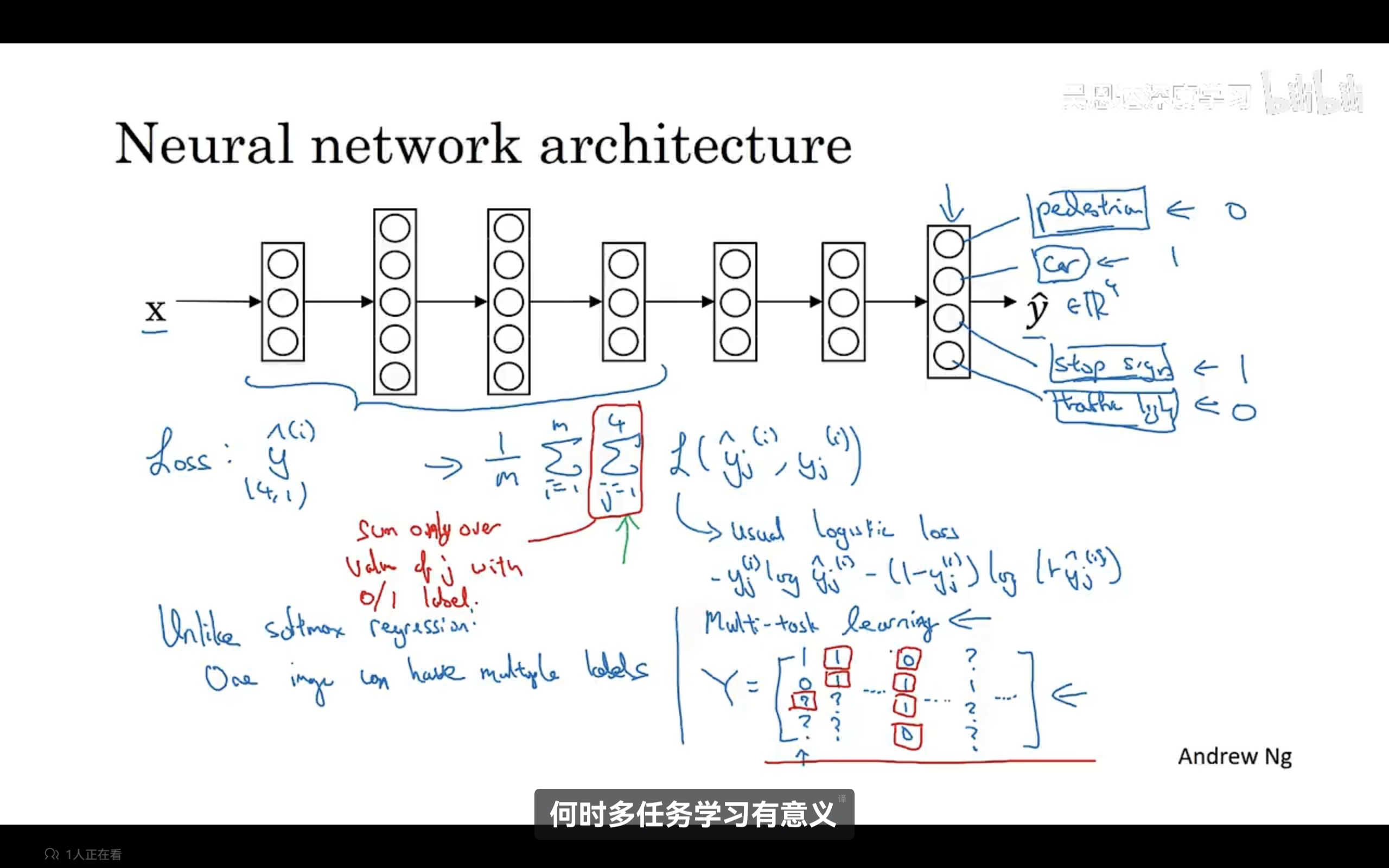 多任务学习:它与softmax不同之处在于它可以有多个标签,尽管里面有些标签可以缺失了,我们仍然可以用一个神经网络来训练数据,同时做多个识别任务。示例如下: