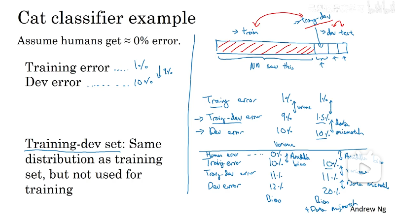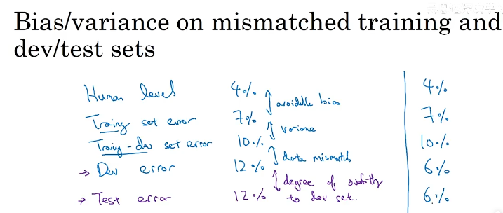 当我们的训练集、开发测试集来自不同分布时,偏差和方差分析也会变得不同。在这种情况下通常会造成训练误差和验证误差差别较大,即模型具有较高的方差,这时候我们可以新增一个数据集,叫做训练开发集(打乱训练集,从训练集中截取一部分作为训练开发集),开发集和测试集的分布相同,训练集和训练开发集的分布相同,我们用剩下的训练集训练验证模型,会得到三个误差(训练误差、训练开发误差、开发(即验证)误差),这样我们进能够进行误差分析,得到模型的问题所在(示例如下)。