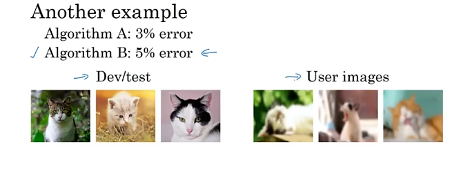 - 指标和开发测试集失效:开发测试集中模型a的错误率比模型b 的低,但是实际应用中b却表现得更好,示例如下。