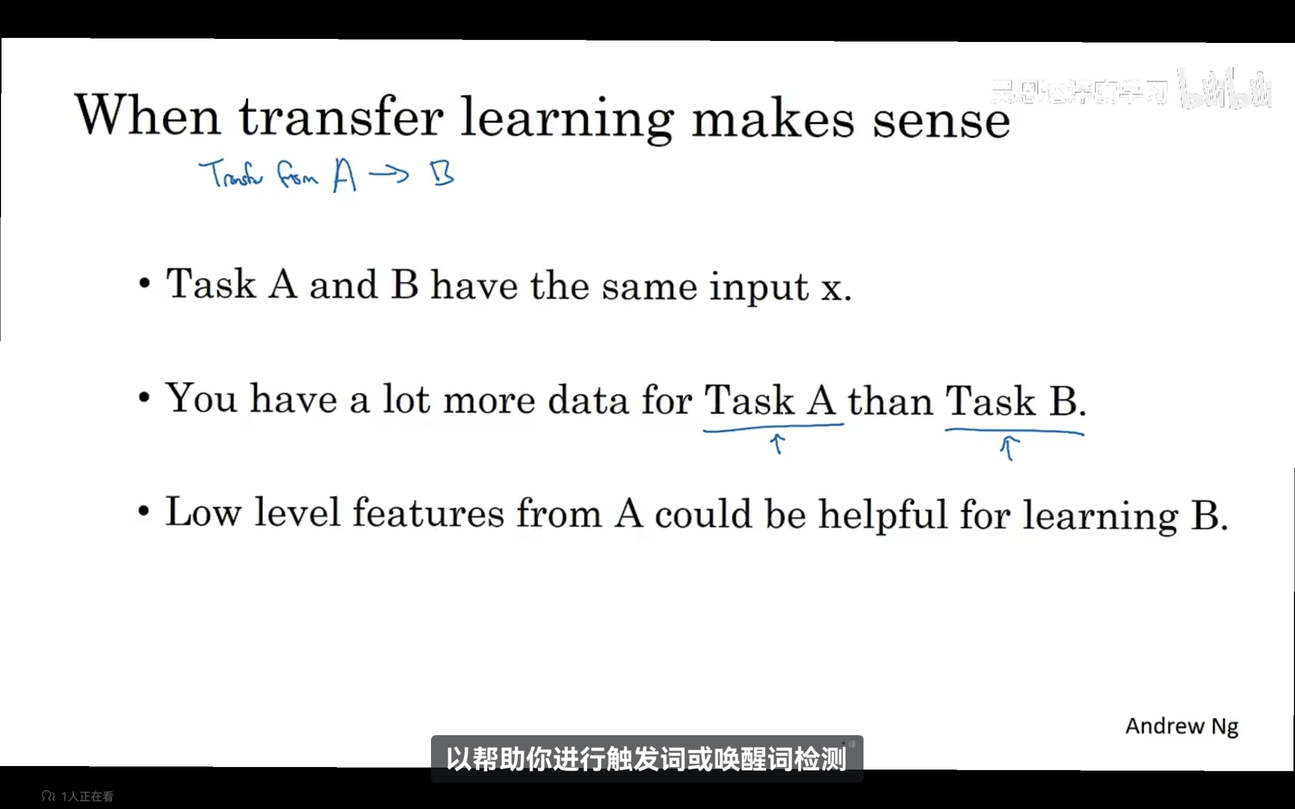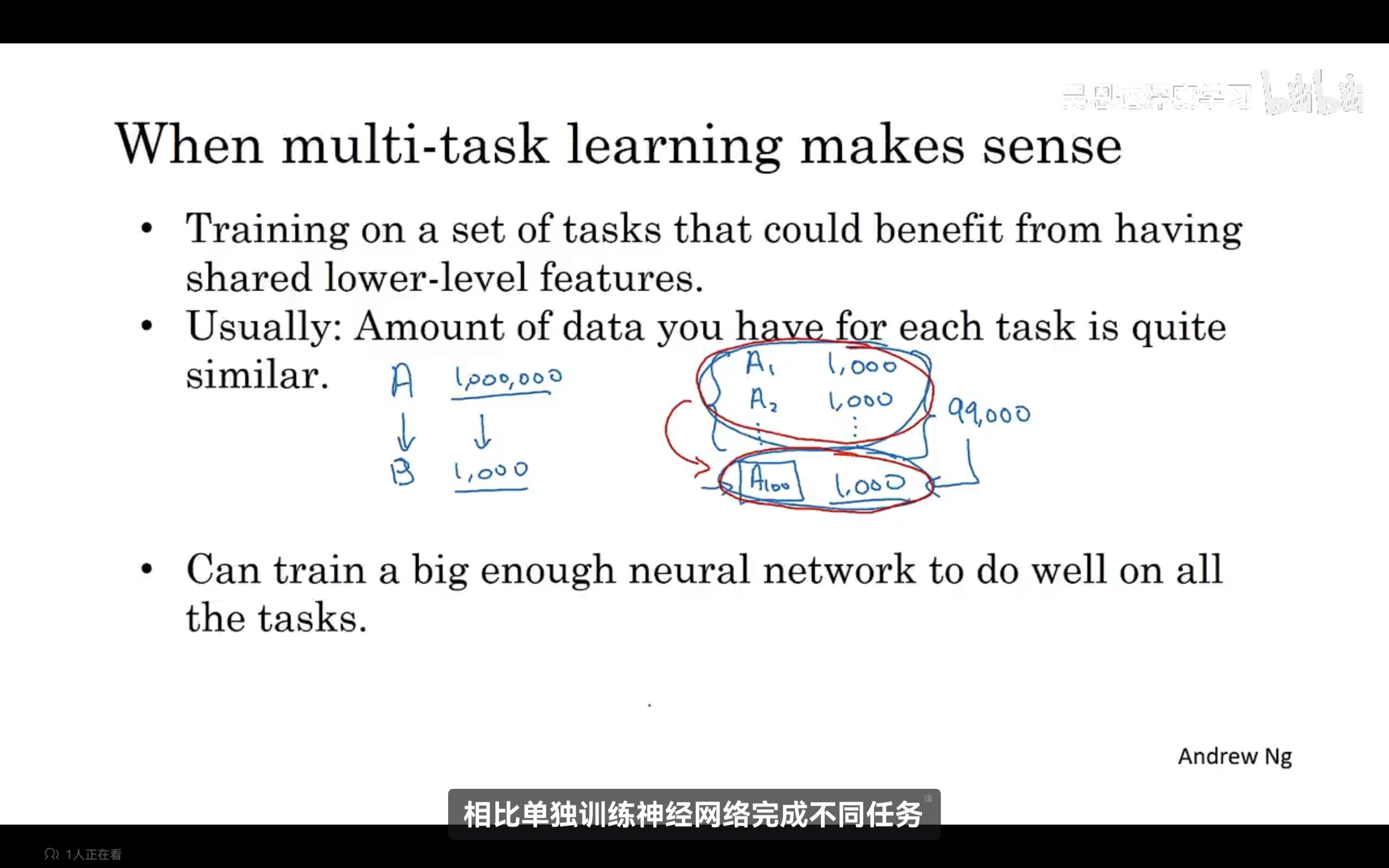 什么时候多任务学习有意义呢?有三个条件:1、能从低级共享特征中受益;2、每个任务的数据量相当;(不是必须的)3、多任务学习在大神经网络上训练时更有意义,使用多任务学习训练一个神经网络,可以等价于训练解决单个任务的多个神经网络模型。研究证明,多任务学习唯一损害性能相比单独训练神经网络就是神经网络不够大。 -